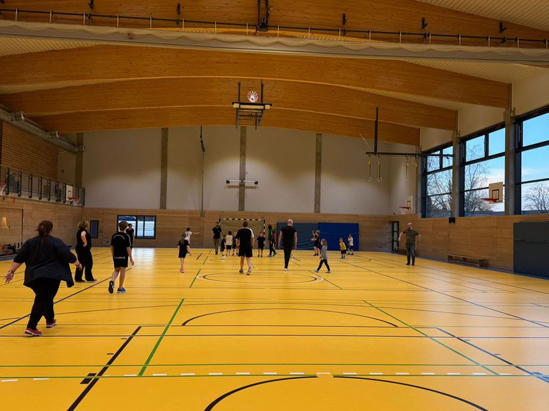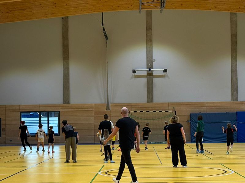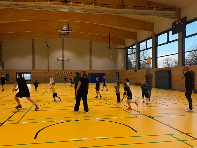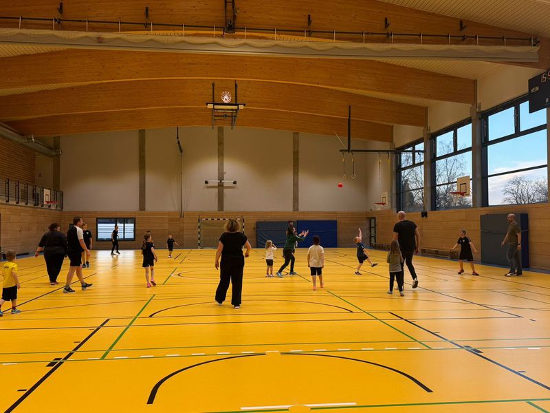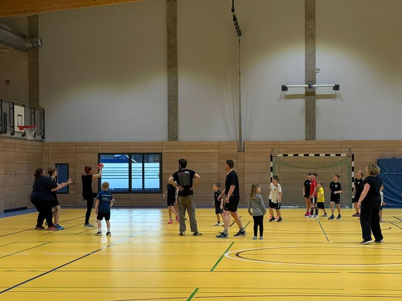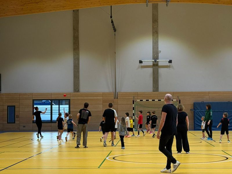 Dann folgt das legendäre Aufwärmen, das die Kinder anleiten. Die Eltern machen tapfer alles mit – egal ob sie früher selbst Handball gespielt haben oder zum ersten Mal in ihrem Leben einen Ball richtig herum halten.